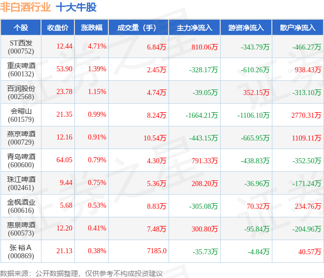 个股表现方面,非白酒行业当日领涨股为ST西发(000752),该股当日报收12.44,上涨4.71%,成交量6.84万,主力资金净流入810.06万元。重庆啤酒(600132)以上涨1.39%紧随其后,该股当日成交量2.45万,主力资金净流出328.17万元。除此之外,百润股份(002568)、会稽山(601579)、燕京啤酒(000729)均进入当日牛股之列。具体个股列表见下表: