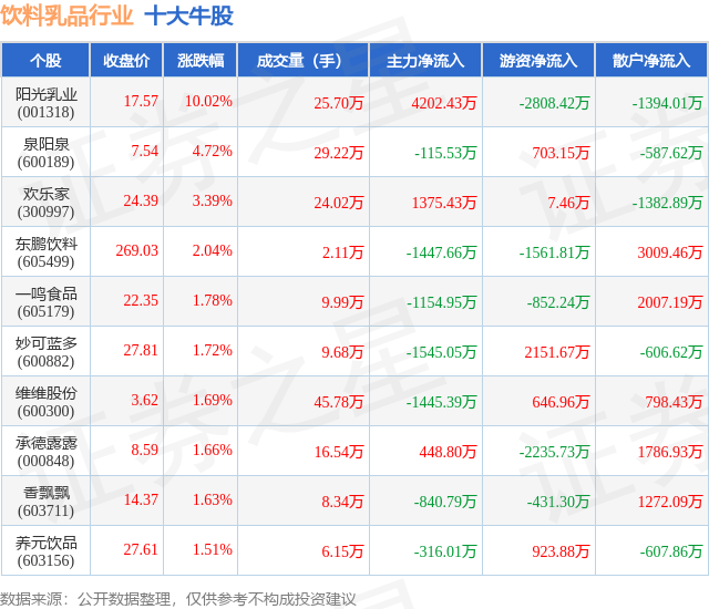 个股表现方面,饮料乳品行业当日领涨股为阳光乳业(001318),该股当日报收17.57,上涨10.02%,成交量25.7万,主力资金净流入4202.43万元。泉阳泉(600189)以上涨4.72%紧随其后,该股当日成交量29.22万,主力资金净流出115.53万元。除此之外,欢乐家(300997)、东鹏饮料(605499)、一鸣食品(605179)均进入当日牛股之列。具体个股列表见下表: