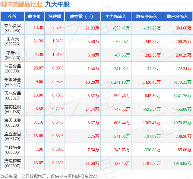个股表现方面,调味发酵品行业当日领涨股为安记食品(603696),该股当日报收13.3,上涨2.62%,成交量21.23万,主力资金净流出553.41万元。朱老六(920726)以上涨1.81%紧随其后,该股当日成交量5.48万,主力资金净流出67.56万元。除此之外,朱老六(920726)、仲景食品(300908)、千禾味业(603027)均进入当日牛股之列。具体个股列表见下表: