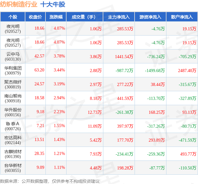 个股表现方面,纺织制造行业当日领涨股为夜光明(920527),该股当日报收18.66,上涨4.07%,成交量1.06万,主力资金净流入285.53万元。夜光明(920527)以上涨4.07%紧随其后,该股当日成交量1.06万,主力资金净流入285.53万元。除此之外,云中马(603130)、华利集团(300979)、聚杰微纤(300819)均进入当日牛股之列。具体个股列表见下表: