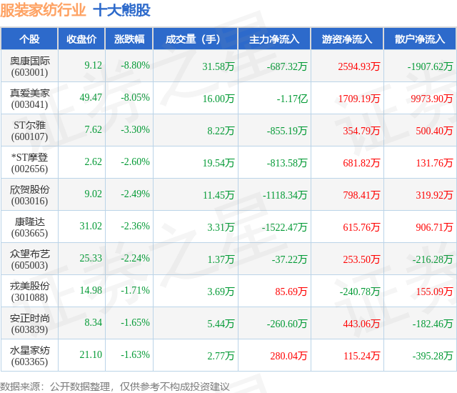 个股表现方面,服装家纺行业当日领跌股为奥康国际(603001),该股当日报收9.12,下跌8.8%,成交量31.58万,主力资金净流出687.32万元。真爱美家(003041)以下跌8.05%紧随其后,该股当日成交量16.0万,主力资金净流出1.17亿元。除此之外,ST尔雅(600107)、*ST摩登(002656)、欣贺股份(003016)均进入当日熊股之列。具体个股列表见下表:
