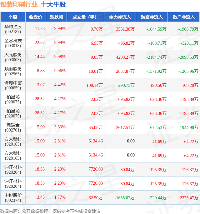 个股表现方面,包装印刷行业当日领涨股为华源控股(002787),该股当日报收11.78,上涨9.99%,成交量9.7万,主力资金净流入3551.38万元。金富科技(003018)以上涨9.99%紧随其后,该股当日成交量6.95万,主力资金净流入496.82万元。除此之外,天元股份(003003)、顺灏股份(002565)、珠海中富(000659)均进入当日牛股之列。具体个股列表见下表: