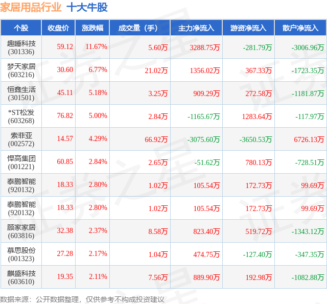 个股表现方面,家居用品行业当日领涨股为趣睡科技(301336),该股当日报收59.12,上涨11.67%,成交量5.6万,主力资金净流入3288.75万元。梦天家居(603216)以上涨6.77%紧随其后,该股当日成交量21.02万,主力资金净流入1356.02万元。除此之外,恒鑫生活(301501)、*ST松发(603268)、索菲亚(002572)均进入当日牛股之列。具体个股列表见下表: