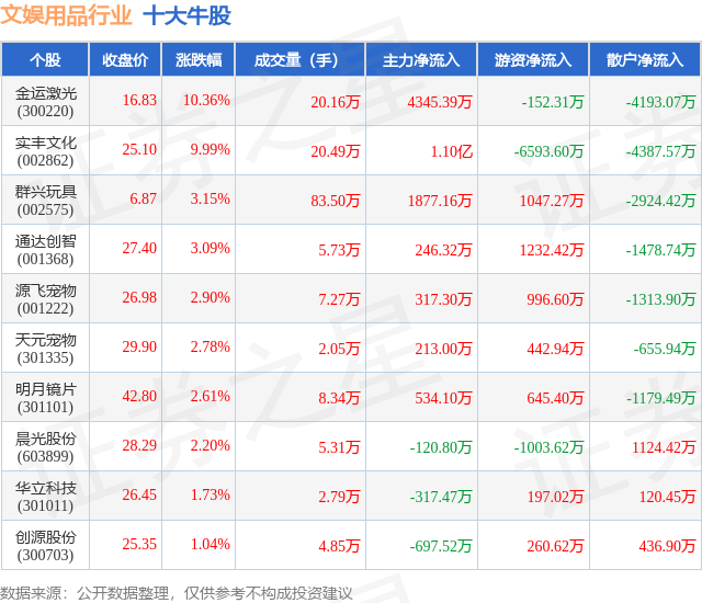 个股表现方面,文娱用品行业当日领涨股为金运激光(300220),该股当日报收16.83,上涨10.36%,成交量20.16万,主力资金净流入4345.39万元。实丰文化(002862)以上涨9.99%紧随其后,该股当日成交量20.49万,主力资金净流入1.1亿元。除此之外,群兴玩具(002575)、通达创智(001368)、源飞宠物(001222)均进入当日牛股之列。具体个股列表见下表:
