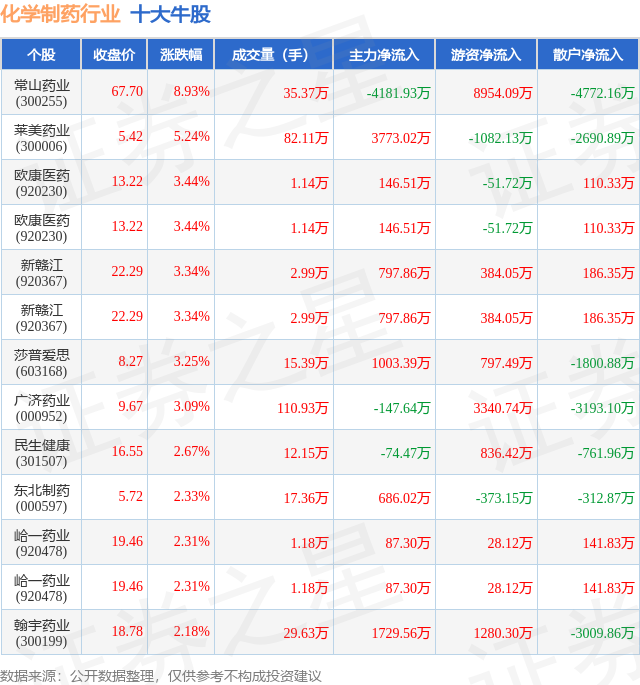 个股表现方面,化学制药行业当日领涨股为常山药业(300255),该股当日报收67.7,上涨8.93%,成交量35.37万,主力资金净流出4181.93万元。莱美药业(300006)以上涨5.24%紧随其后,该股当日成交量82.11万,主力资金净流入3773.02万元。除此之外,欧康医药(920230)、欧康医药(920230)、新赣江(920367)均进入当日牛股之列。具体个股列表见下表: