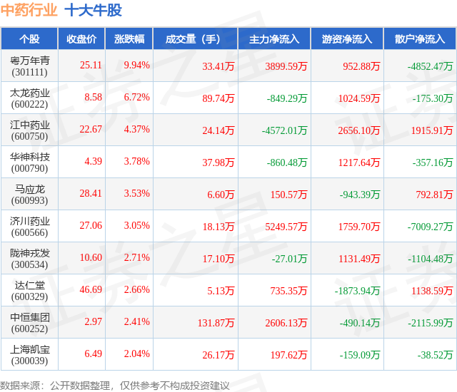 个股表现方面,中药行业当日领涨股为粤万年青(301111),该股当日报收25.11,上涨9.94%,成交量33.41万,主力资金净流入3899.59万元。太龙药业(600222)以上涨6.72%紧随其后,该股当日成交量89.74万,主力资金净流出849.29万元。除此之外,江中药业(600750)、华神科技(000790)、马应龙(600993)均进入当日牛股之列。具体个股列表见下表: