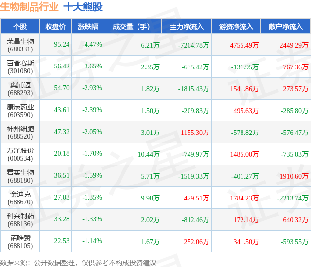 个股表现方面,生物制品行业当日领跌股为荣昌生物(688331),该股当日报收95.24,下跌4.47%,成交量6.21万,主力资金净流出7204.78万元。百普赛斯(301080)以下跌3.65%紧随其后,该股当日成交量2.35万,主力资金净流出635.42万元。除此之外,奥浦迈(688293)、康辰药业(603590)、神州细胞(688520)均进入当日熊股之列。具体个股列表见下表: