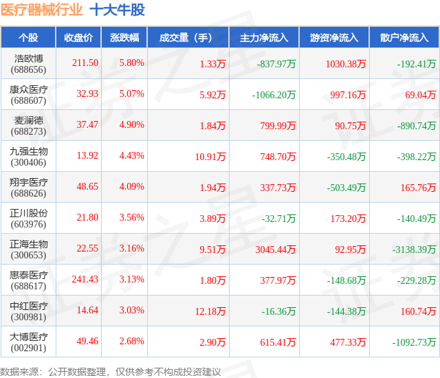个股表现方面,医疗器械行业当日领涨股为浩欧博(688656),该股当日报收211.5,上涨5.8%,成交量1.33万,主力资金净流出837.97万元。康众医疗(688607)以上涨5.07%紧随其后,该股当日成交量5.92万,主力资金净流出1066.2万元。除此之外,麦澜德(688273)、九强生物(300406)、翔宇医疗(688626)均进入当日牛股之列。具体个股列表见下表: