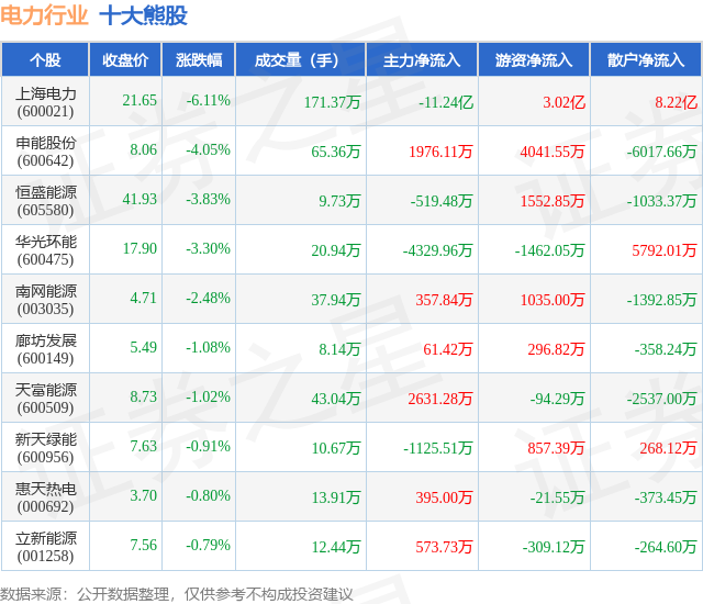 个股表现方面,电力行业当日领跌股为上海电力(600021),该股当日报收21.65,下跌6.11%,成交量171.37万,主力资金净流出11.24亿元。申能股份(600642)以下跌4.05%紧随其后,该股当日成交量65.36万,主力资金净流入1976.11万元。除此之外,恒盛能源(605580)、华光环能(600475)、南网能源(003035)均进入当日熊股之列。具体个股列表见下表: