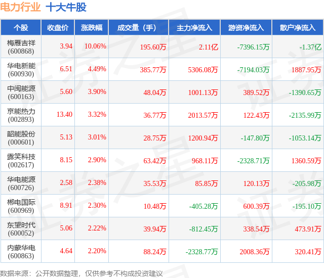 个股表现方面,电力行业当日领涨股为梅雁吉祥(600868),该股当日报收3.94,上涨10.06%,成交量195.6万,主力资金净流入2.11亿元。华电新能(600930)以上涨4.49%紧随其后,该股当日成交量385.77万,主力资金净流入5306.08万元。除此之外,中闽能源(600163)、京能热力(002893)、韶能股份(000601)均进入当日牛股之列。具体个股列表见下表: