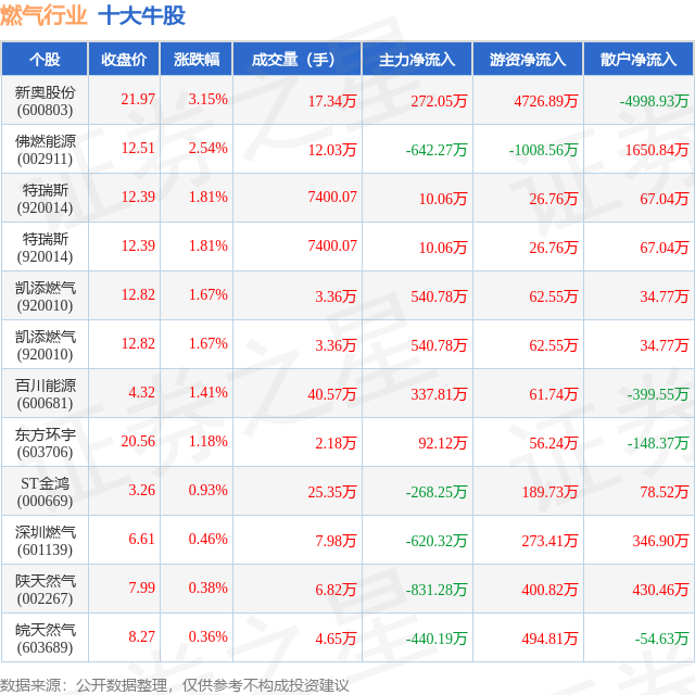 个股表现方面,燃气行业当日领涨股为新奥股份(600803),该股当日报收21.97,上涨3.15%,成交量17.34万,主力资金净流入272.05万元。佛燃能源(002911)以上涨2.54%紧随其后,该股当日成交量12.03万,主力资金净流出642.27万元。除此之外,特瑞斯(920014)、特瑞斯(920014)、凯添燃气(920010)均进入当日牛股之列。具体个股列表见下表: