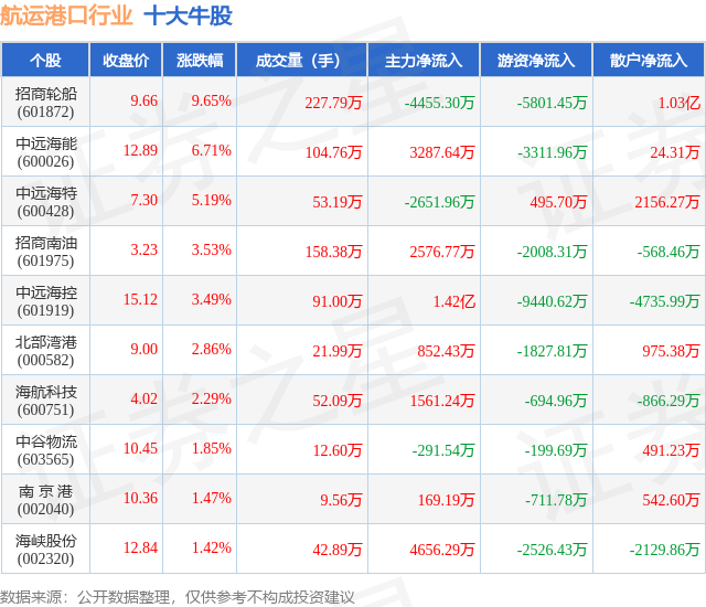 个股表现方面,航运港口行业当日领涨股为招商轮船(601872),该股当日报收9.66,上涨9.65%,成交量227.79万,主力资金净流出4455.3万元。中远海能(600026)以上涨6.71%紧随其后,该股当日成交量104.76万,主力资金净流入3287.64万元。除此之外,中远海特(600428)、招商南油(601975)、中远海控(601919)均进入当日牛股之列。具体个股列表见下表: