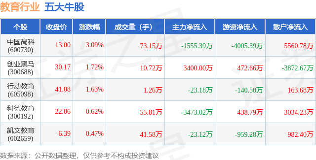 个股表现方面,教育行业当日领涨股为中国高科(600730),该股当日报收13.0,上涨3.09%,成交量73.15万,主力资金净流出1555.39万元。创业黑马(300688)以上涨1.72%紧随其后,该股当日成交量10.72万,主力资金净流入3400.0万元。除此之外,行动教育(605098)、科德教育(300192)、凯文教育(002659)均进入当日牛股之列。具体个股列表见下表:
