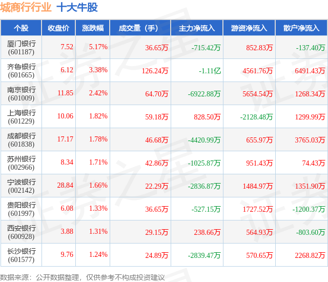 个股表现方面,城商行行业当日领涨股为厦门银行(601187),该股当日报收7.52,上涨5.17%,成交量36.65万,主力资金净流出715.42万元。齐鲁银行(601665)以上涨3.38%紧随其后,该股当日成交量126.24万,主力资金净流出1.11亿元。除此之外,南京银行(601009)、上海银行(601229)、成都银行(601838)均进入当日牛股之列。具体个股列表见下表: