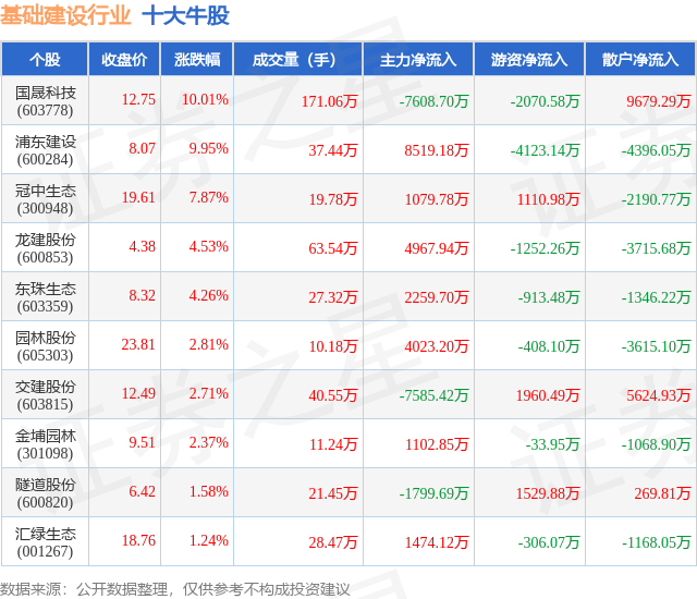 个股表现方面,基础建设行业当日领涨股为国晟科技(603778),该股当日报收12.75,上涨10.01%,成交量171.06万,主力资金净流出7608.7万元。浦东建设(600284)以上涨9.95%紧随其后,该股当日成交量37.44万,主力资金净流入8519.18万元。除此之外,冠中生态(300948)、龙建股份(600853)、东珠生态(603359)均进入当日牛股之列。具体个股列表见下表: