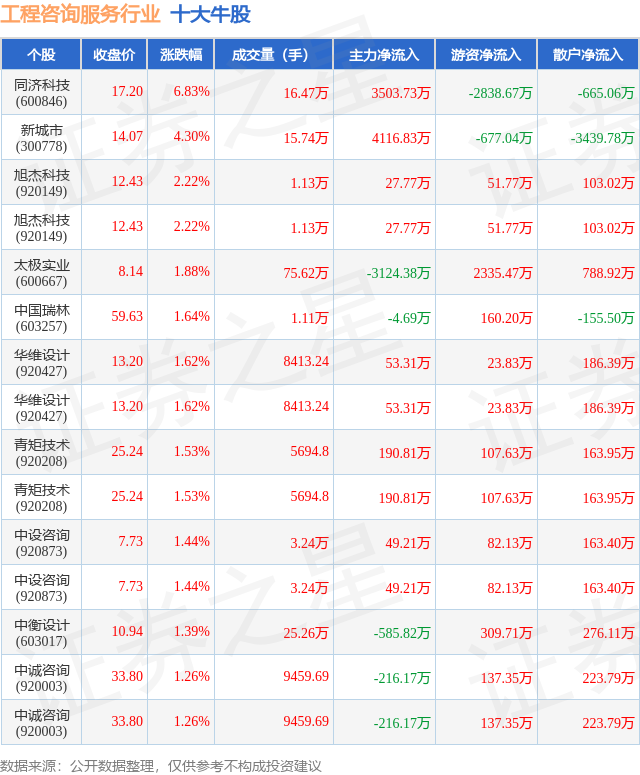 个股表现方面,工程咨询服务行业当日领涨股为同济科技(600846),该股当日报收17.2,上涨6.83%,成交量16.47万,主力资金净流入3503.73万元。新城市(300778)以上涨4.3%紧随其后,该股当日成交量15.74万,主力资金净流入4116.83万元。除此之外,旭杰科技(920149)、旭杰科技(920149)、太极实业(600667)均进入当日牛股之列。具体个股列表见下表: