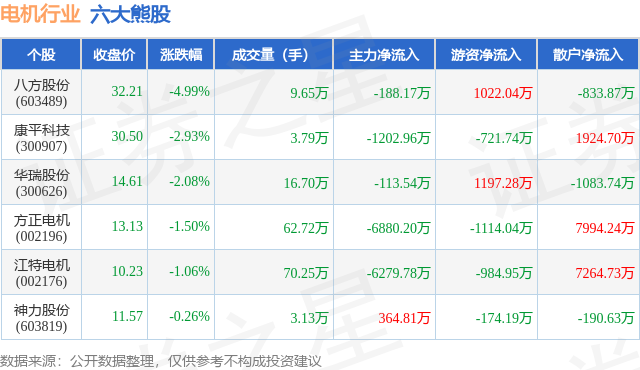 个股表现方面,电机行业当日领跌股为八方股份(603489),该股当日报收32.21,下跌4.99%,成交量9.65万,主力资金净流出188.17万元。康平科技(300907)以下跌2.93%紧随其后,该股当日成交量3.79万,主力资金净流出1202.96万元。除此之外,华瑞股份(300626)、方正电机(002196)、江特电机(002176)均进入当日熊股之列。具体个股列表见下表: