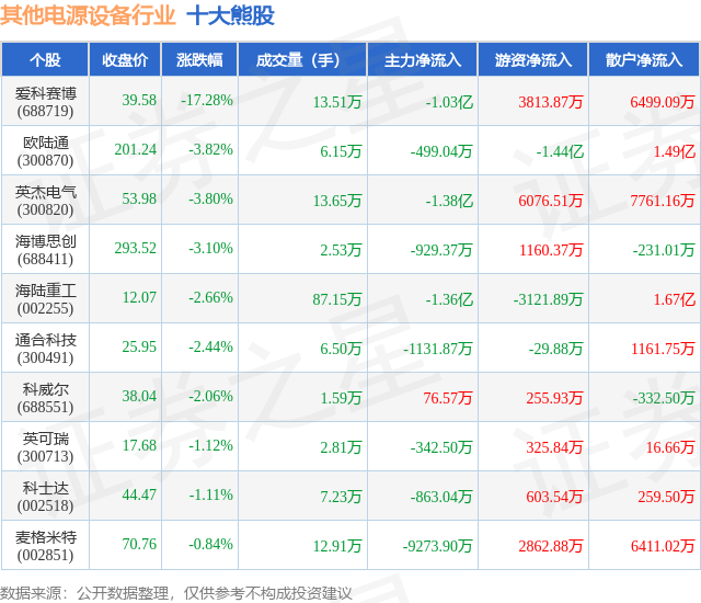 个股表现方面,其他电源设备行业当日领跌股为爱科赛博(688719),该股当日报收39.58,下跌17.28%,成交量13.51万,主力资金净流出1.03亿元。欧陆通(300870)以下跌3.82%紧随其后,该股当日成交量6.15万,主力资金净流出499.04万元。除此之外,英杰电气(300820)、海博思创(688411)、海陆重工(002255)均进入当日熊股之列。具体个股列表见下表: