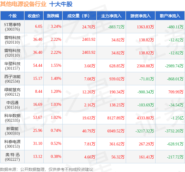 个股表现方面,其他电源设备行业当日领涨股为ST易事特(300376),该股当日报收6.05,上涨3.24%,成交量24.7万,主力资金净流出883.72万元。雷特科技(920110)以上涨2.22%紧随其后,该股当日成交量2404.0,主力资金净流入34.82万元。除此之外,雷特科技(920110)、华塑科技(301157)、西子洁能(002534)均进入当日牛股之列。具体个股列表见下表: