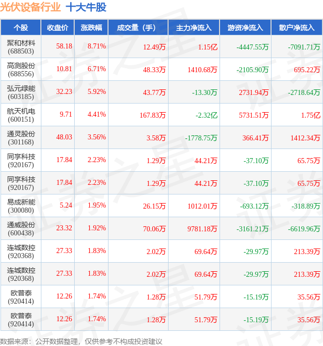 个股表现方面,光伏设备行业当日领涨股为聚和材料(688503),该股当日报收58.18,上涨8.71%,成交量12.49万,主力资金净流入1.15亿元。高测股份(688556)以上涨6.71%紧随其后,该股当日成交量48.33万,主力资金净流入1410.68万元。除此之外,弘元绿能(603185)、航天机电(600151)、通灵股份(301168)均进入当日牛股之列。具体个股列表见下表: