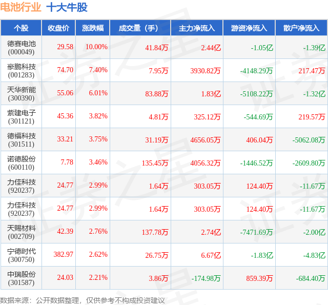 个股表现方面,电池行业当日领涨股为德赛电池(000049),该股当日报收29.58,上涨10.0%,成交量41.84万,主力资金净流入2.44亿元。豪鹏科技(001283)以上涨7.4%紧随其后,该股当日成交量7.95万,主力资金净流入3930.82万元。除此之外,天华新能(300390)、紫建电子(301121)、德福科技(301511)均进入当日牛股之列。具体个股列表见下表: