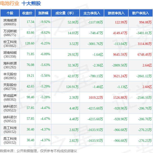个股表现方面,电池行业当日领跌股为滨海能源(000695),该股当日报收17.34,下跌9.92%,成交量52.0万,主力资金净流出1117.08万元。万润新能(688275)以下跌8.62%紧随其后,该股当日成交量14.03万,主力资金净流出748.47万元。除此之外,宏工科技(301662)、湖南裕能(301358)、海科新源(301292)均进入当日熊股之列。具体个股列表见下表: