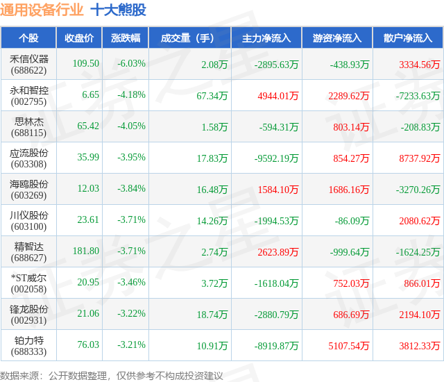 个股表现方面,通用设备行业当日领跌股为禾信仪器(688622),该股当日报收109.5,下跌6.03%,成交量2.08万,主力资金净流出2895.63万元。永和智控(002795)以下跌4.18%紧随其后,该股当日成交量67.34万,主力资金净流入4944.01万元。除此之外,思林杰(688115)、应流股份(603308)、海鸥股份(603269)均进入当日熊股之列。具体个股列表见下表: