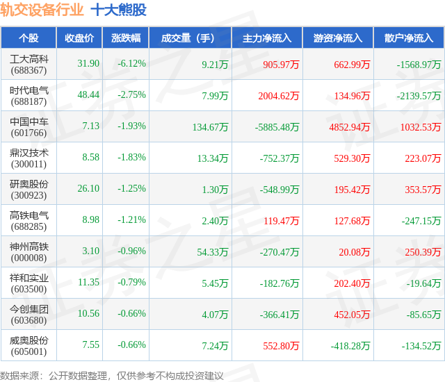 个股表现方面,轨交设备行业当日领跌股为工大高科(688367),该股当日报收31.9,下跌6.12%,成交量9.21万,主力资金净流入905.97万元。时代电气(688187)以下跌2.75%紧随其后,该股当日成交量7.99万,主力资金净流入2004.62万元。除此之外,中国中车(601766)、鼎汉技术(300011)、研奥股份(300923)均进入当日熊股之列。具体个股列表见下表:
