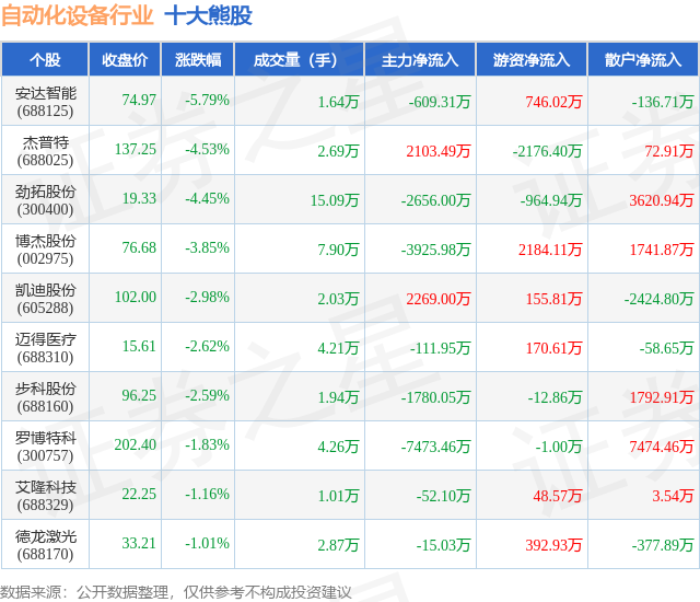 个股表现方面,自动化设备行业当日领跌股为安达智能(688125),该股当日报收74.97,下跌5.79%,成交量1.64万,主力资金净流出609.31万元。杰普特(688025)以下跌4.53%紧随其后,该股当日成交量2.69万,主力资金净流入2103.49万元。除此之外,劲拓股份(300400)、博杰股份(002975)、凯迪股份(605288)均进入当日熊股之列。具体个股列表见下表: