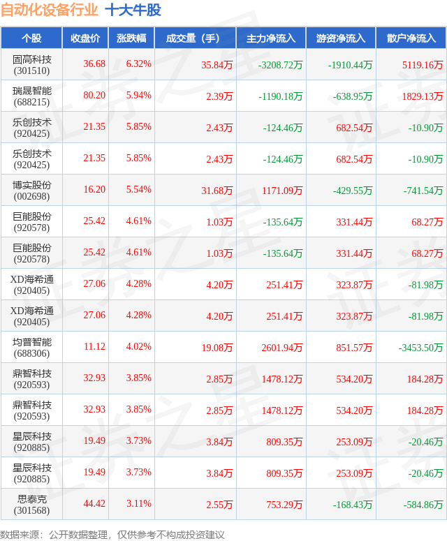 个股表现方面,自动化设备行业当日领涨股为固高科技(301510),该股当日报收36.68,上涨6.32%,成交量35.84万,主力资金净流出3208.72万元。瑞晟智能(688215)以上涨5.94%紧随其后,该股当日成交量2.39万,主力资金净流出1190.18万元。除此之外,乐创技术(920425)、乐创技术(920425)、博实股份(002698)均进入当日牛股之列。具体个股列表见下表: