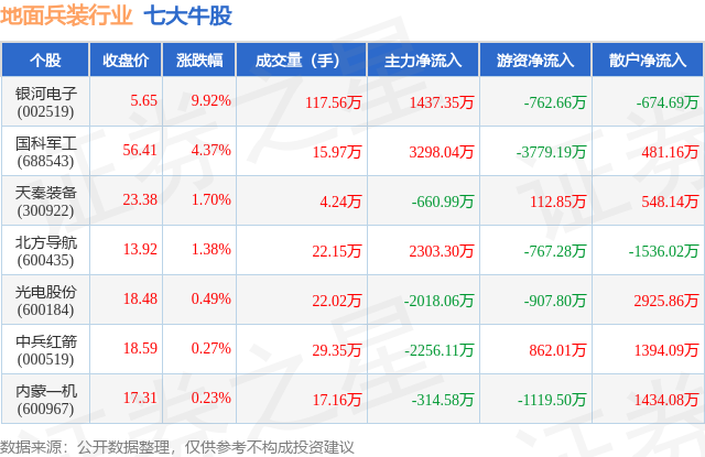 个股表现方面,地面兵装行业当日领涨股为银河电子(002519),该股当日报收5.65,上涨9.92%,成交量117.56万,主力资金净流入1437.35万元。国科军工(688543)以上涨4.37%紧随其后,该股当日成交量15.97万,主力资金净流入3298.04万元。除此之外,天秦装备(300922)、北方导航(600435)、光电股份(600184)均进入当日牛股之列。具体个股列表见下表: