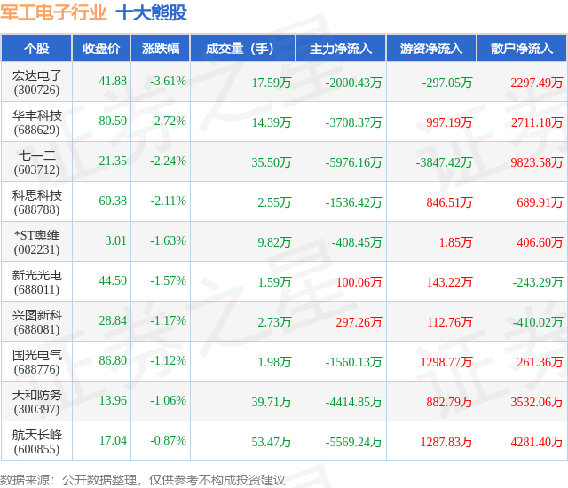 个股表现方面,军工电子行业当日领跌股为宏达电子(300726),该股当日报收41.88,下跌3.61%,成交量17.59万,主力资金净流出2000.43万元。华丰科技(688629)以下跌2.72%紧随其后,该股当日成交量14.39万,主力资金净流出3708.37万元。除此之外,七一二(603712)、科思科技(688788)、*ST奥维(002231)均进入当日熊股之列。具体个股列表见下表:
