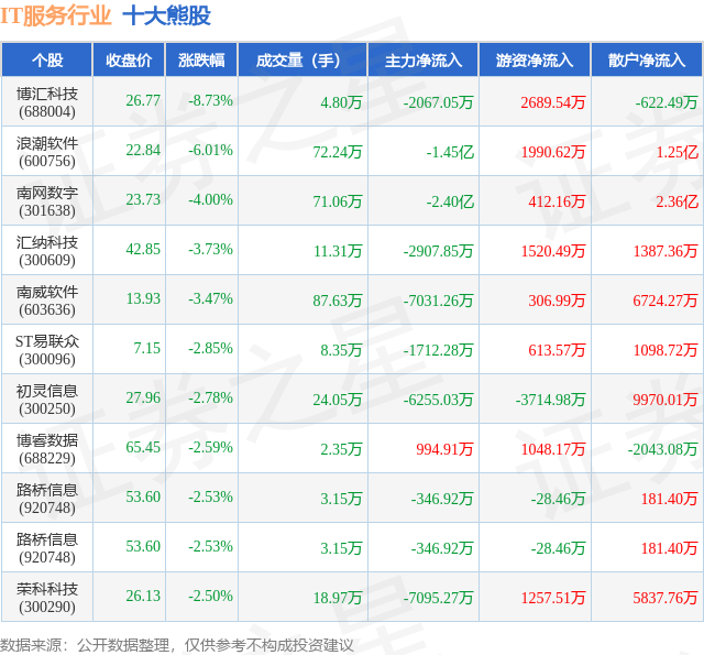 个股表现方面,IT服务行业当日领跌股为博汇科技(688004),该股当日报收26.77,下跌8.73%,成交量4.8万,主力资金净流出2067.05万元。浪潮软件(600756)以下跌6.01%紧随其后,该股当日成交量72.24万,主力资金净流出1.45亿元。除此之外,南网数字(301638)、汇纳科技(300609)、南威软件(603636)均进入当日熊股之列。具体个股列表见下表: