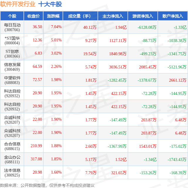 个股表现方面,软件开发行业当日领涨股为每日互动(300766),该股当日报收36.5,上涨7.04%,成交量40.12万,主力资金净流入1.94亿元。*ST国华(000004)以上涨5.01%紧随其后,该股当日成交量9.27万,主力资金净流入1127.11万元。除此之外,ST创意(300366)、信息发展(300469)、中望软件(688083)均进入当日牛股之列。具体个股列表见下表: