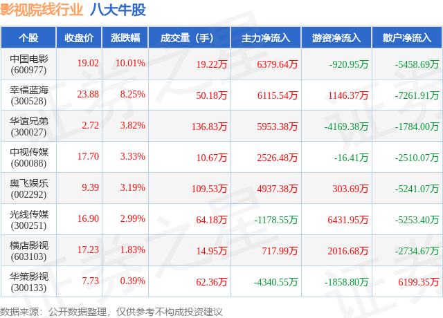 个股表现方面,影视院线行业当日领涨股为中国电影(600977),该股当日报收19.02,上涨10.01%,成交量19.22万,主力资金净流入6379.64万元。幸福蓝海(300528)以上涨8.25%紧随其后,该股当日成交量50.18万,主力资金净流入6115.54万元。除此之外,华谊兄弟(300027)、中视传媒(600088)、奥飞娱乐(002292)均进入当日牛股之列。具体个股列表见下表: