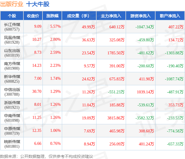 个股表现方面,出版行业当日领涨股为长江传媒(600757),该股当日报收9.09,上涨5.57%,成交量49.99万,主力资金净流入640.12万元。凤凰传媒(601928)以上涨2.8%紧随其后,该股当日成交量36.63万,主力资金净流入325.08万元。除此之外,山东出版(601019)、南方传媒(601900)、新华传媒(600825)均进入当日牛股之列。具体个股列表见下表: