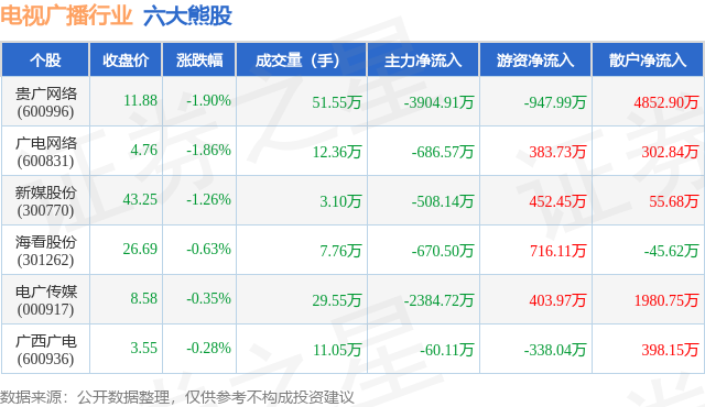 个股表现方面,电视广播行业当日领跌股为贵广网络(600996),该股当日报收11.88,下跌1.9%,成交量51.55万,主力资金净流出3904.91万元。广电网络(600831)以下跌1.86%紧随其后,该股当日成交量12.36万,主力资金净流出686.57万元。除此之外,新媒股份(300770)、海看股份(301262)、电广传媒(000917)均进入当日熊股之列。具体个股列表见下表: