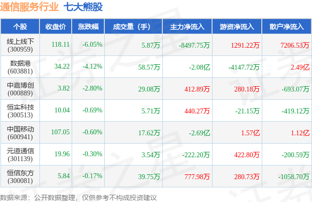 个股表现方面,通信服务行业当日领跌股为线上线下(300959),该股当日报收118.11,下跌6.05%,成交量5.87万,主力资金净流出8497.75万元。数据港(603881)以下跌4.12%紧随其后,该股当日成交量58.57万,主力资金净流出2.08亿元。除此之外,中嘉博创(000889)、恒实科技(300513)、中国移动(600941)均进入当日熊股之列。具体个股列表见下表: