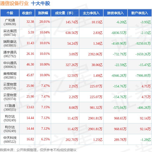 个股表现方面,通信设备行业当日领涨股为广和通(300638),该股当日报收32.38,上涨20.01%,成交量145.74万,主力资金净流入10.15亿元。实达集团(600734)以上涨10.04%紧随其后,该股当日成交量638.56万,主力资金净流入2.83亿元。除此之外,瑞斯康达(603803)、通宇通讯(002792)、中兴通讯(000063)均进入当日牛股之列。具体个股列表见下表: