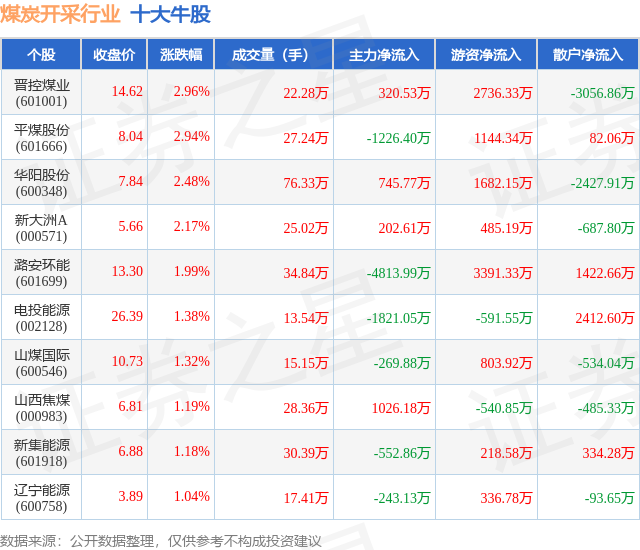 个股表现方面,煤炭开采行业当日领涨股为晋控煤业(601001),该股当日报收14.62,上涨2.96%,成交量22.28万,主力资金净流入320.53万元。平煤股份(601666)以上涨2.94%紧随其后,该股当日成交量27.24万,主力资金净流出1226.4万元。除此之外,华阳股份(600348)、新大洲A(000571)、潞安环能(601699)均进入当日牛股之列。具体个股列表见下表: