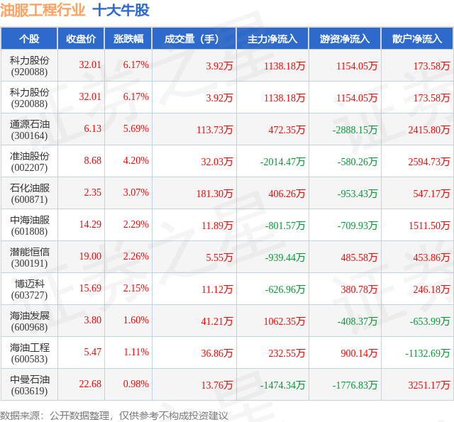 个股表现方面,油服工程行业当日领涨股为科力股份(920088),该股当日报收32.01,上涨6.17%,成交量3.92万,主力资金净流入1138.18万元。科力股份(920088)以上涨6.17%紧随其后,该股当日成交量3.92万,主力资金净流入1138.18万元。除此之外,通源石油(300164)、准油股份(002207)、石化油服(600871)均进入当日牛股之列。具体个股列表见下表: