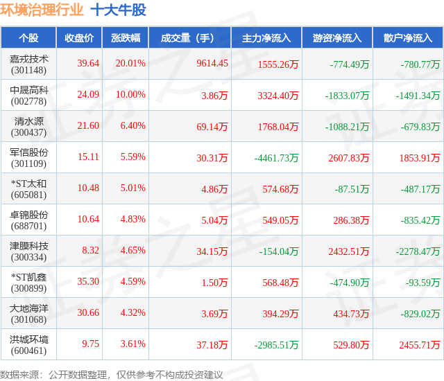 个股表现方面,环境治理行业当日领涨股为嘉戎技术(301148),该股当日报收39.64,上涨20.01%,成交量9614.0,主力资金净流入1555.26万元。中晟高科(002778)以上涨10.0%紧随其后,该股当日成交量3.86万,主力资金净流入3324.4万元。除此之外,清水源(300437)、军信股份(301109)、*ST太和(605081)均进入当日牛股之列。具体个股列表见下表: