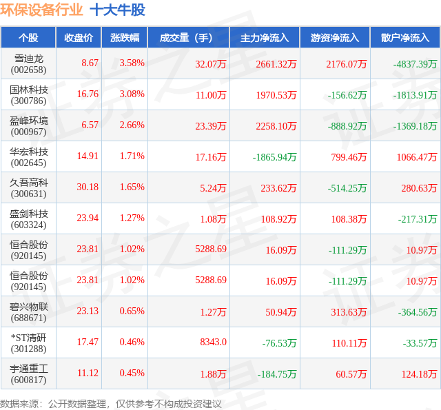 个股表现方面,环保设备行业当日领涨股为雪迪龙(002658),该股当日报收8.67,上涨3.58%,成交量32.07万,主力资金净流入2661.32万元。国林科技(300786)以上涨3.08%紧随其后,该股当日成交量11.0万,主力资金净流入1970.53万元。除此之外,盈峰环境(000967)、华宏科技(002645)、久吾高科(300631)均进入当日牛股之列。具体个股列表见下表: