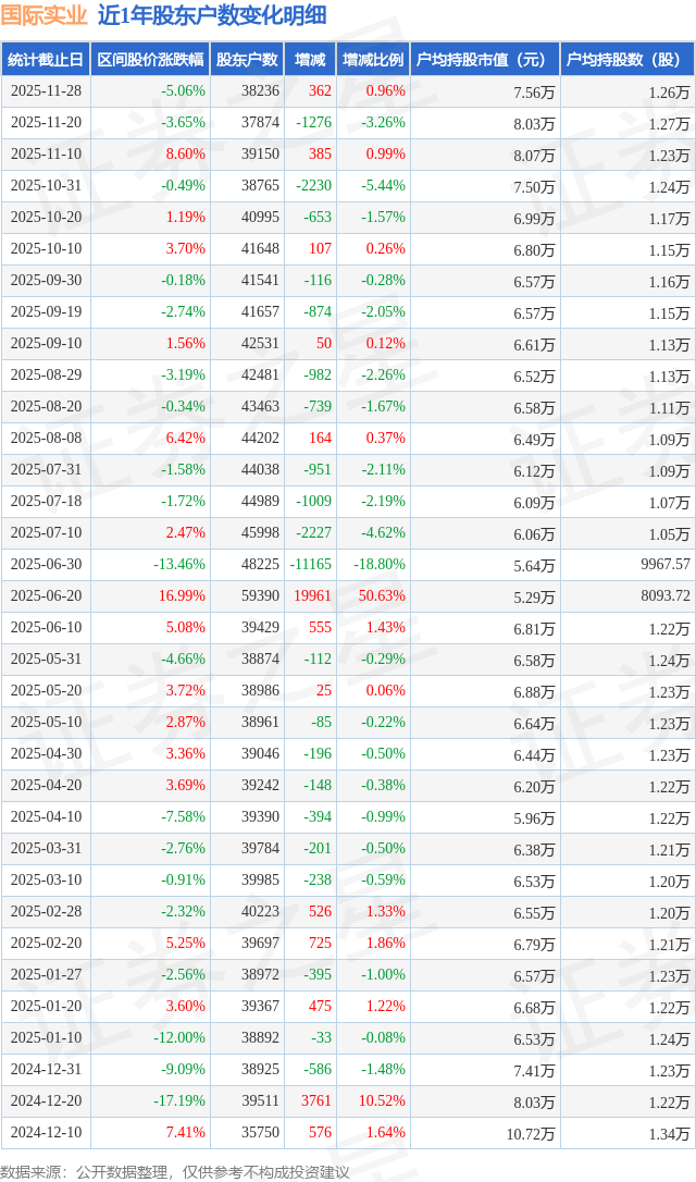 从股价来看,2025年11月20日至2025年11月28日,国际实业区间跌幅为5.06%,在此期间股东户数增加362.0户,增幅为0.96%。