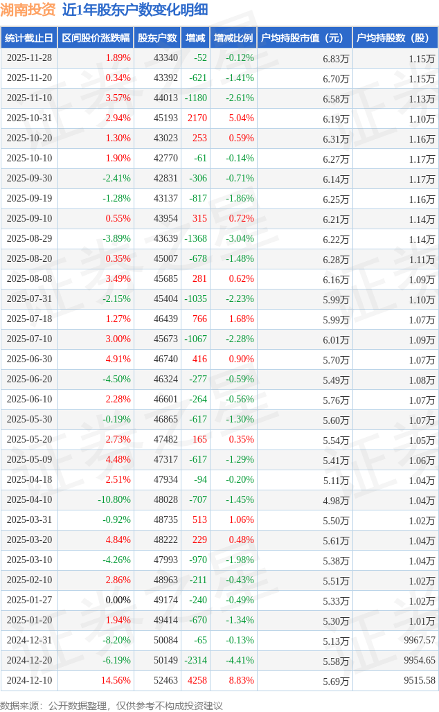从股价来看,2025年11月20日至2025年11月28日,湖南投资区间涨幅为1.89%,在此期间股东户数减少52.0户,减幅为0.12%。