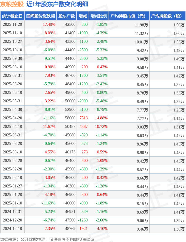 从股价来看,2025年10月27日至2025年11月20日,京粮控股区间涨幅为17.4%,在此期间股东户数减少800.0户,减幅为1.85%。
