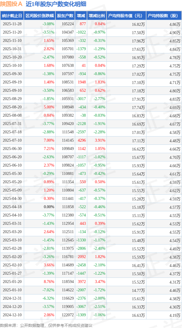 从股价来看,2025年11月20日至2025年11月28日,陕国投A区间跌幅为3.08%,在此期间股东户数增加877.0户,增幅为0.84%。