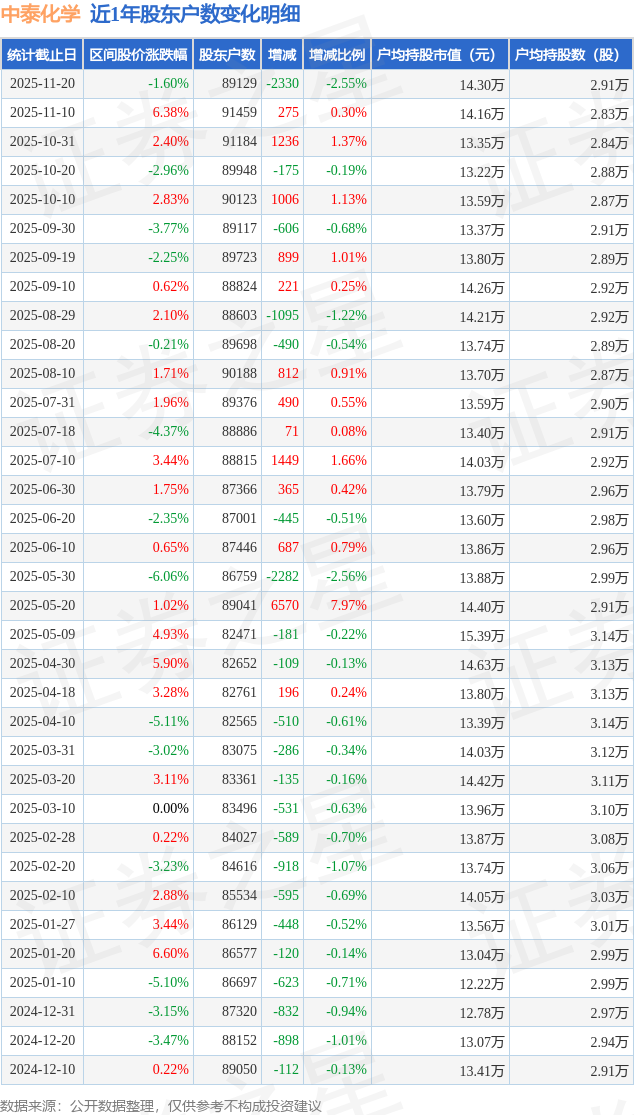 从股价来看,2025年11月10日至2025年11月20日,中泰化学区间跌幅为1.6%,在此期间股东户数减少2330.0户,减幅为2.55%。