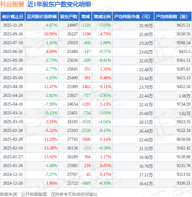 从股价来看,2025年9月30日至2025年11月20日,科远智慧区间跌幅为4.67%,在此期间股东户数减少1320.0户,减幅为5.03%。