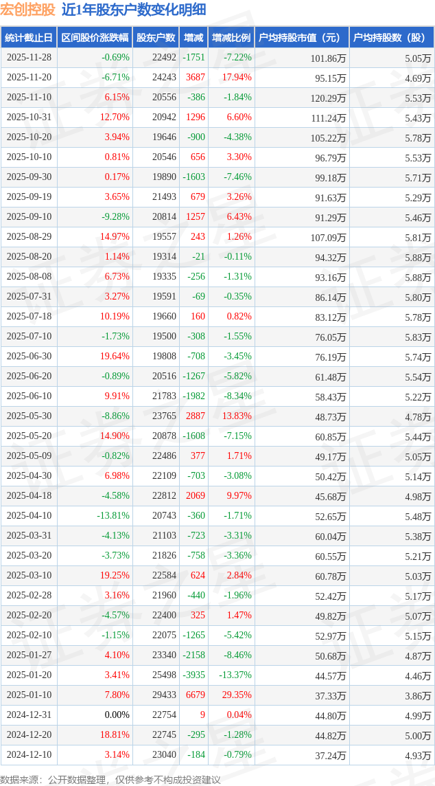 从股价来看,2025年11月20日至2025年11月28日,宏创控股区间跌幅为0.69%,在此期间股东户数减少1751.0户,减幅为7.22%。